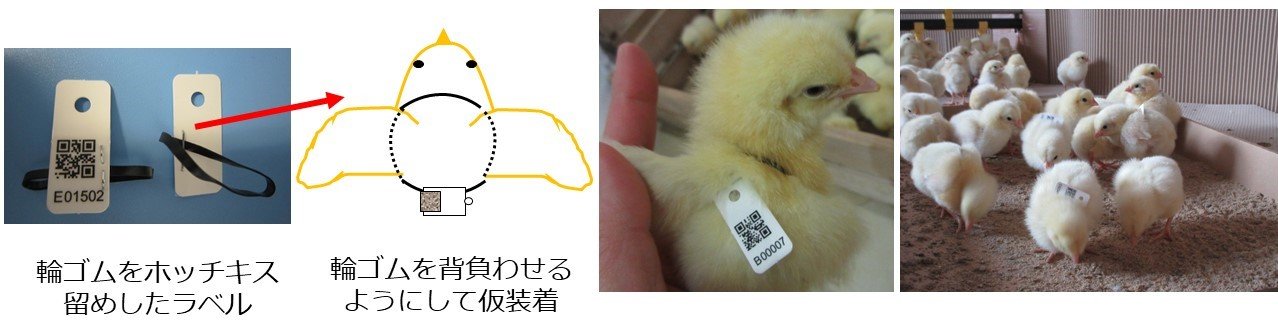 そのため、QRコードラベルに輪ゴムをホッチキス止めし、この輪ゴムをヒナに背負わせるようにして仮装着します。その後、ヒナが大きくなり、翼膜がある程度大きくなってから付け替えます。