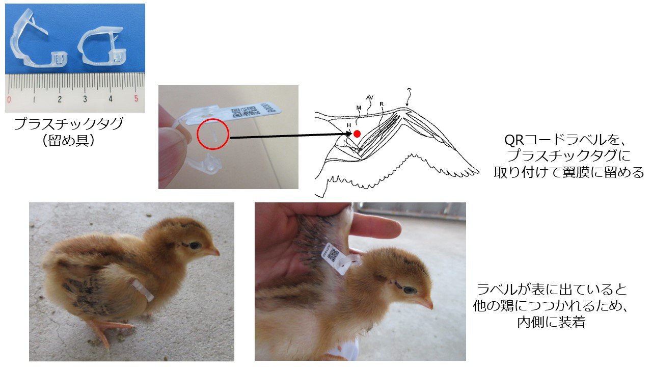QRコードラベルは、ヒナの翼膜にプラスチックタグ(留め具)を使って装着します。