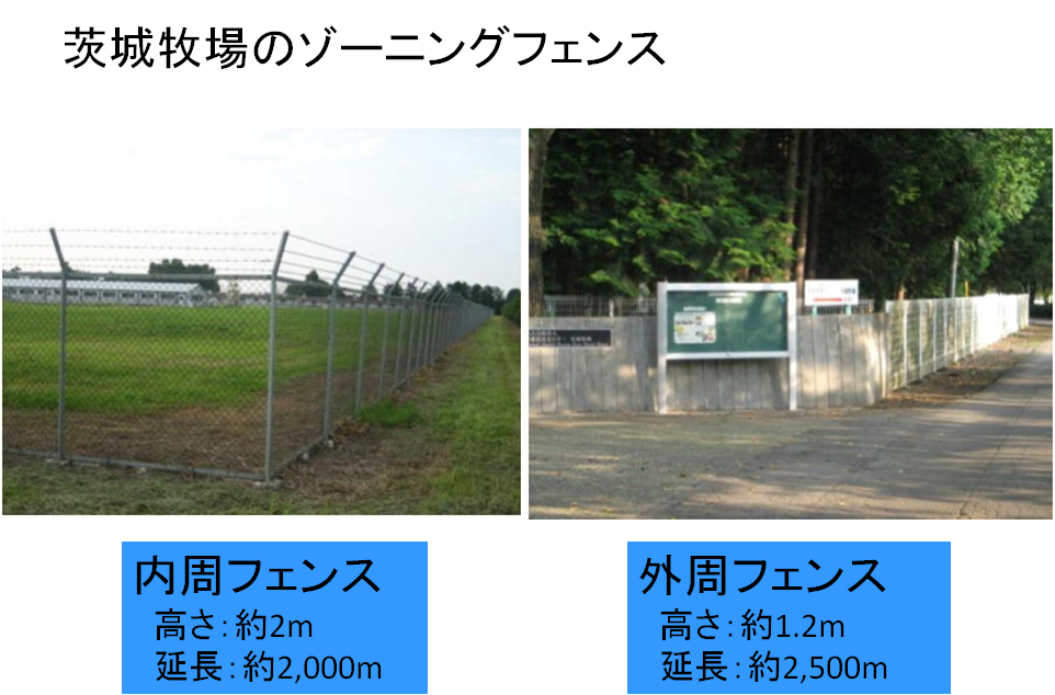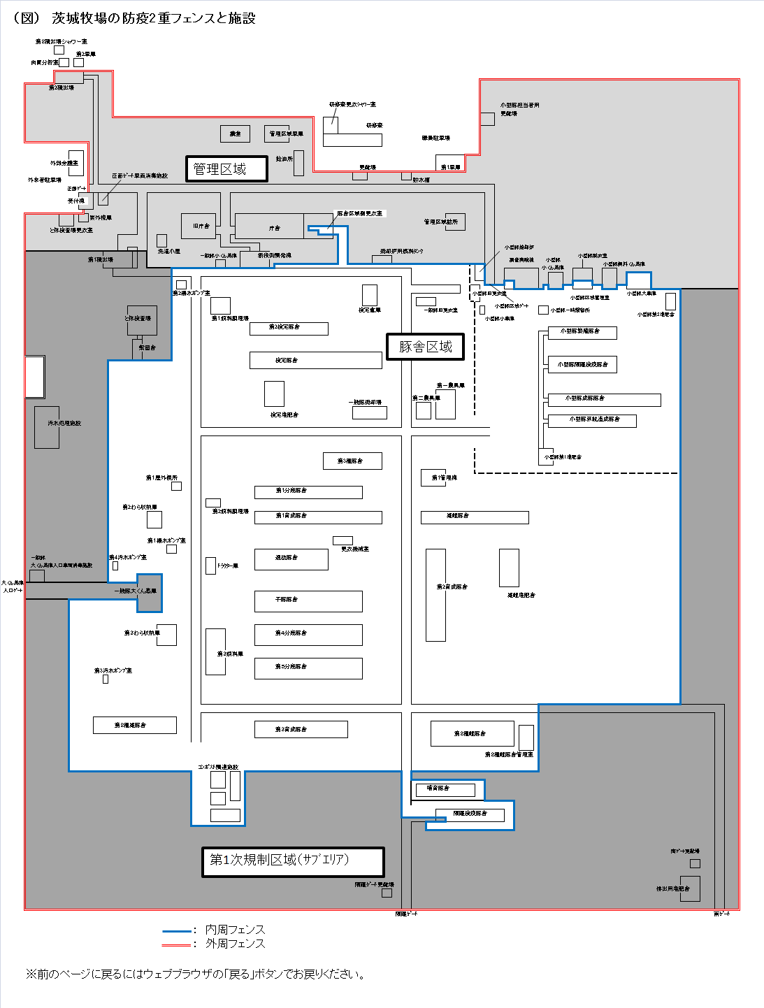 施設面では、豚舎区域の外側に二重のフェンス(内周フェンス、外周フェンス)を設置するとともに、フェンスとフェンスの間にサブエリアを設けており、これにより豚舎区域は、農場外から一定の距離を保っています(図.茨城牧場平面図参照)。