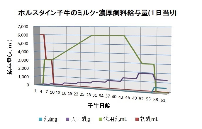 子牛は、3日間初乳給与した後、代用乳(粉ミルク)をこの期間給与します。4~5週目を給与量ピークにした強化哺乳を行っています。これは高タンパク質・低脂肪の代用乳を使い、過肥にさせずにフレームサイズ(骨と筋肉)の発達を加速させる哺乳方法です。