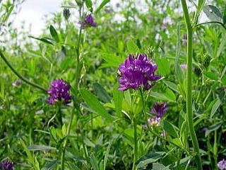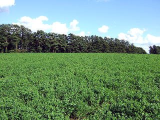 ・種子はアルファルファ単播ではなくオーチャードグラス種子を加えて混播しています。オーチャードグラスを混播することにより収量性が向上し、雑草が抑制されます。また、サイレージ調製時(乳酸発酵時)には糖含量の少ないアルファルファに代わり糖補填を行います。