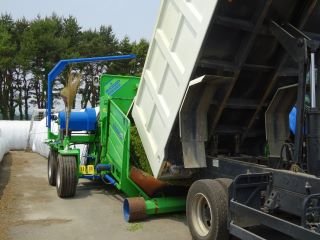 ・モアコンディショナーで刈取り後、葉部の脱落に気を配りつつ水分調整を行い、フォーレージハーベスターで細断し、サイレージに調製しています。