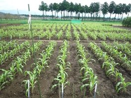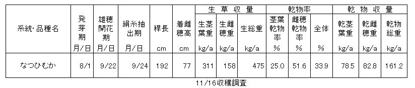 令和3年度は、「なつひむか」の展示を実施しました。「なつひむか」は、農研機構 九州沖縄総合研究センターが育成した遅播・夏播向けの青刈りトウモロコシです。暖地の夏播き栽培の重要障害である南方さび病とワラビー萎縮症に抵抗性で、夏播き栽培では登熟が早い晩生の飼料用トウモロコシ品種です。耐倒伏性、折損抵抗性も強く、晩播栽培にも適しています。