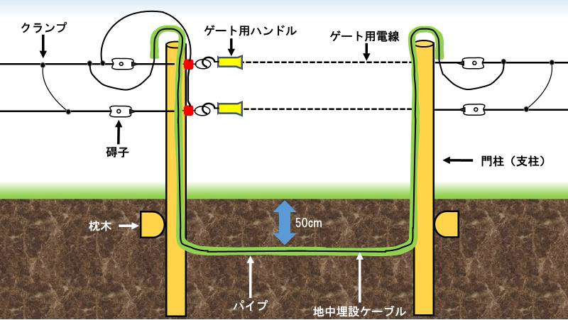 もし、放牧地に複数のゲートがある場合、一つでもゲートが開いている状態では回路が成り立ちません。これを解消するため、ワイヤーを地中に埋設し