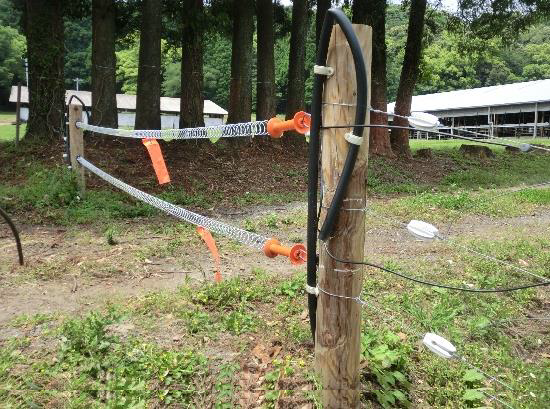 宮崎牧場では幅4mのゲートにはバネ仕様のスプリングタイプ(写真24)を、幅5~7mにはゴム状のワイヤー仕様のロープタイプ(写真25)を使用する等、場所によって使い分けています。