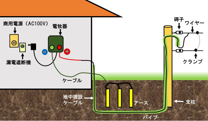 アースを設置したら、アース棒からのリード線は電牧器のマイナス側と接続します。