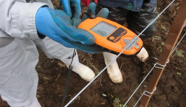 電牧器を稼働し、電気テスターを使用して各段とも3000V以上の電圧が来ていることを確認します。なお、脱柵防止には3000V 以上の電圧を確保することが必要とされています(写真28) 。