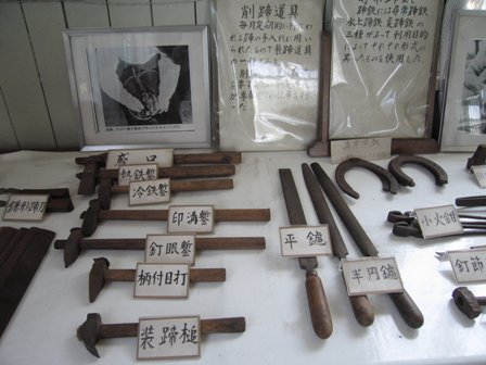 蹄鉄には、尋常蹄鉄、氷上蹄鉄、変蹄鉄の三種類がありましたが、長野種馬所では雪が少なく、また、変形した蹄の馬は種馬にしなかったことから、尋常蹄鉄が主でした。