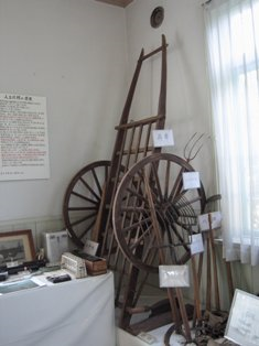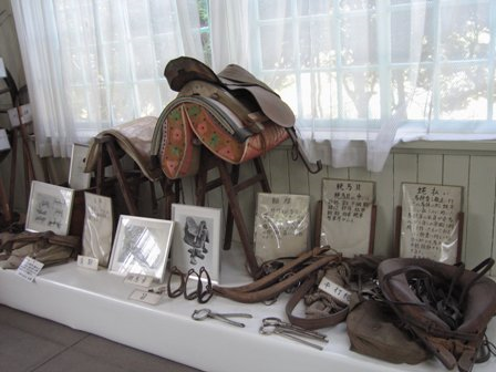 頭絡、背鞍、革手綱、調馬索、馬衣などの馬具です。1906(明治39)年から1949(昭和24)年まで種牡馬が、また、1950年代後半まで農作業用の馬がけい養されていました。