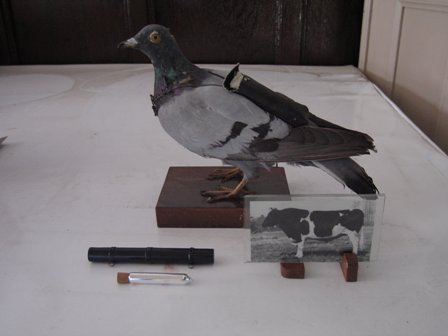1952(昭和27)年5月11日には、伝書鳩が背中に魔法ビンの輸送器を背負い、大宮種畜牧場から丸子町まで130km間を3時間余りで飛行した実績があります。その際、4頭に授精し、2頭が生産され、その1頭が写真の種牡牛「カーチマスターピースアイドレーズヴェール号」です。交通が不便な1940年~50年代に、遠隔の酪農地帯に対して、伝書鳩による牛の精液輸送を行ったことがあります。