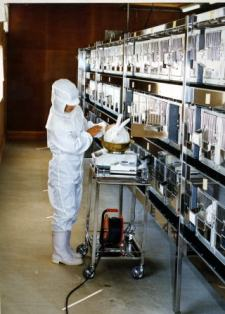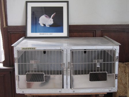 1948(昭和23)年からウサギのけい養を開始し、当初は1箱6房からなる木製の飼育箱で飼養管理されていました。1986(昭和61)年に実験動物としてのウサギの系統造成が始まり、SPF施設においてアルミ製のケージで飼養管理されていました。