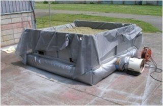 鉄板や鋼材で乾燥用コンテナを作成し、底部は通気が可能なように加工します。土台用コンテナボックス(ビールケースほどの大きさ)とシートで送風部を兼ねる土台を作成し、土台に送風機を取り付けます。