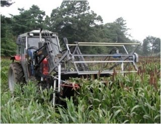 ソルガムの収穫に用いるトラクター用アタッチメントです。種が実る穂先だけをピンポイントで収穫できます。