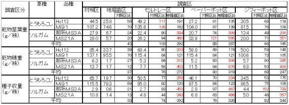 調査区毎の株当たり茎葉重・穂重及び種子収量
