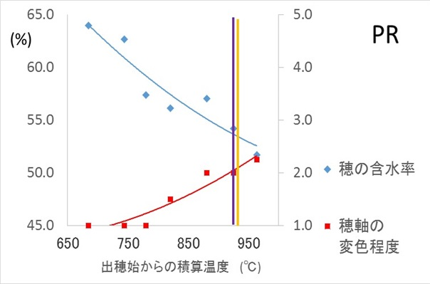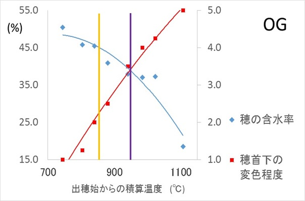 および出穂始からの単純積算温度と穂の水分量および穂の変色程度の関係(右)