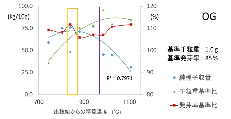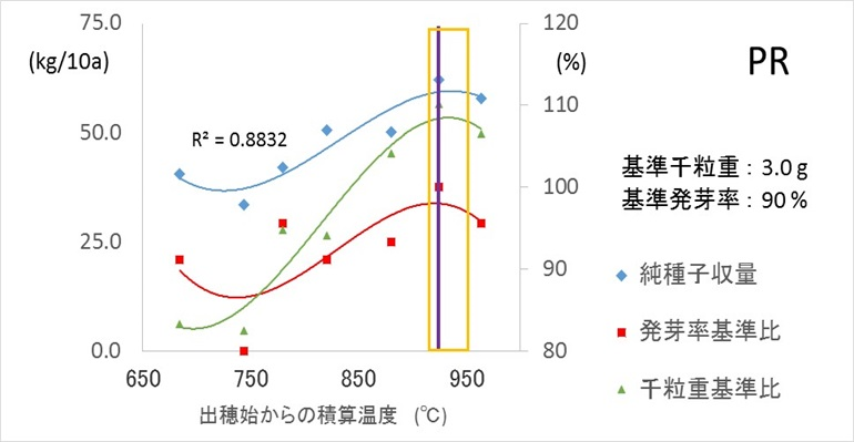 5.具体的データ(出穂始めからの単純積算温度と種子収量、発芽率、千粒重および穂の含水率の関係図)※オレンジ色の線が適期と考えられる時期。