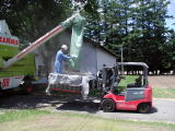 次に収穫したいものがある場合はコンテナを移動し、一時保管庫に保管しておくことにより、ホッパーへの移動や掃除というような作業を急遽行う必要がなくなります。また、マメ科牧草の種子等では一時保管庫での保管中に空気中の水分を吸ってしまい脱粒前にもう一度乾燥させるが、コンテナを乾燥機へ移動させるだけで再乾燥ができ、脱粒・粗選作業が効率よく進み収穫歩留まりの改善が期待されます。また、コンバインからの受け取りから乾燥までを同一のコンテナで行うため従来の体系でのダンプトレーラーから乾燥機への移替え作業が不要となり収穫に要する労力の削減が図れます。
