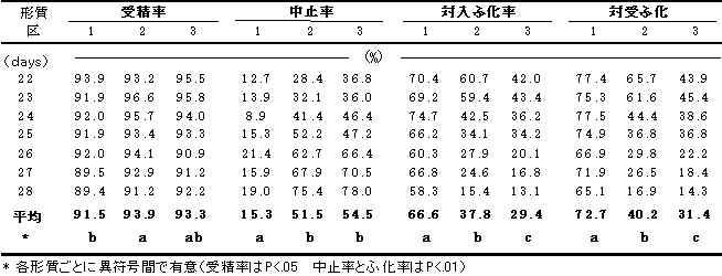 (P<.01)、実用化への可能性が示された。受精率(無精卵には貯卵中の死亡を含む)は、ふ化率とは逆に1区が低く2区との差は有意であった(P<.05)。中止率は1区が他区より有意に低く、2区と3区では顕著な差は見られなかった。以上から、貯卵温度を低めに設定することは、貯卵中の死亡を若干増加させるが、ふ卵前期の死亡を抑える効果があり、鋭端部を上にする貯卵法は、主にふ卵後期の死亡を抑える効果があると考えられた。