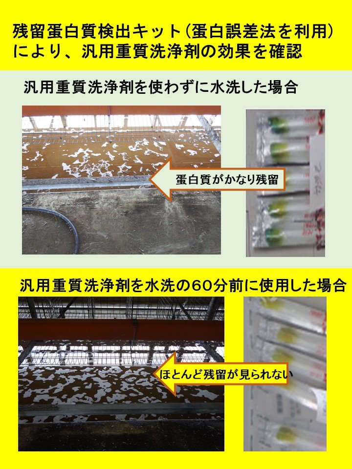 岡崎牧場では、効率的に有機物を除去するため、オールアウト後の鶏舎水洗時に汎用重質洗浄剤を用いることで、良好な成績を得ております。
