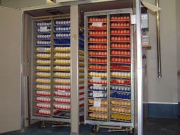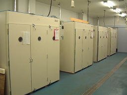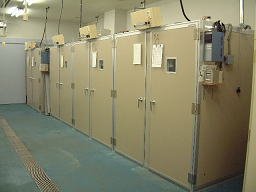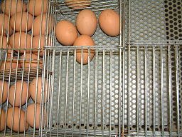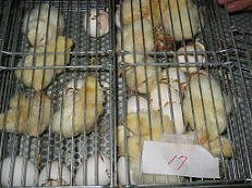 21日目頃からヒヨコが殻を割り始めるので、その前(18日目)にハッチャーへ移動します。種卵は母ごとに小さな仕切りの中にセットします。
