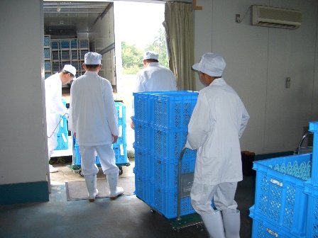 卵をトラックに積み込む作業