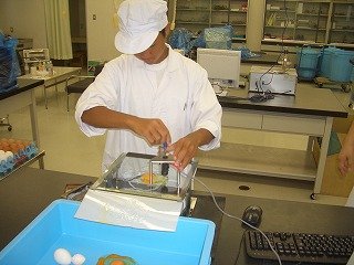 卵質検査では、卵重や卵殻色、卵殻強度、卵白高の測定や卵内異物(肉斑、血斑)の確認を行っていただきました。卵白高の測定では、濃厚卵白や卵黄を傷付けず殻を素早く割ることに苦労する様子も見られましたが、卵内異物の確認を確実に行うなど、どの検査にも集中して取り組んでいました。