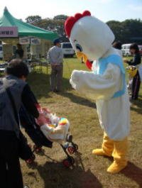 また、今年は新たに職員が着ぐるみでニワトリやヒヨコに扮装し、ヒヨコのふれあい広場と同様、子どもたちに大変人気がありました。また、10月中旬から当場が受け入れた海外研修生9名が、母国語で鶏の部位を説明したり、雄鶏、雌鶏や雛の鳴き声を披露して、多くの人々の関心を引いていました。