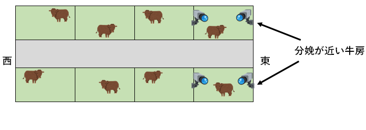 カメラは4つ購入し、分娩予定日が近い2つの牛房の全体が映るよう、下図の通り繁殖牛舎に設置しました。