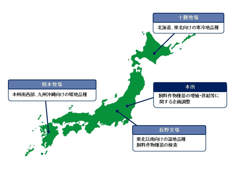家畜改良センターでは当場のほか、茨城牧場長野支場、熊本牧場でも同様に原原種子、原種子の増殖を行っています。