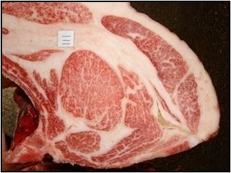 肥育牛の方は市販の肥育用配合飼料を用いて26ヶ月齢まで肥育した結果、BMS11、ロース芯面積61cm2、枝肉重量388.9kgと非常に良好な成績でした。