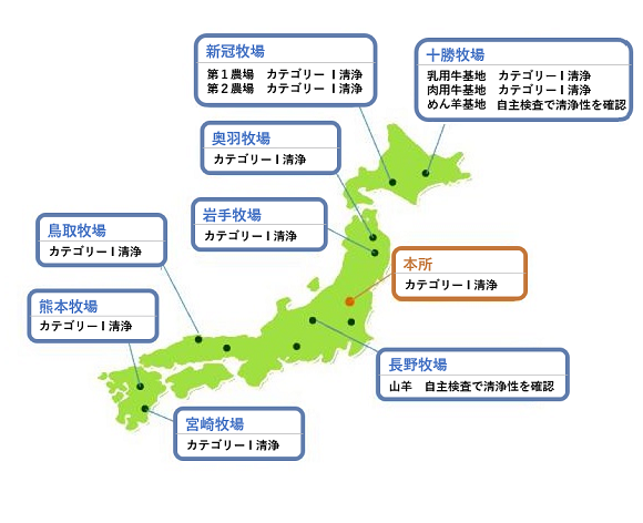 | 十勝牧場 | 乳用牛基地 カテゴリーⅠ(英数字の1)清浄 肉用牛基地 カテゴリーⅠ(英数字の1)清浄 めん羊基地 自主検査で清浄性を確認 |