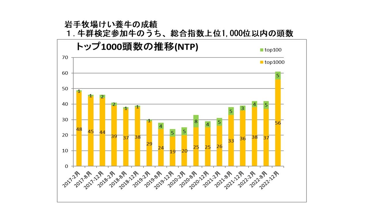 令和4年12月6日にホルスタイン種評価結果(2022-12月)が公表され、岩手牧場けい養牛のうち、牛群検定参加牛の総合指数上位がRE ワルシ ノルダウ ストイツク セカンド ET(NTP(総合指数):+3091)で30位(前回19位)に、未経産牛の総合指数がRE ザツプ エメンタール ジヤマルコ セカンド(NTP(総合指数):+3557)で12位(前回14位)ランクインしております。