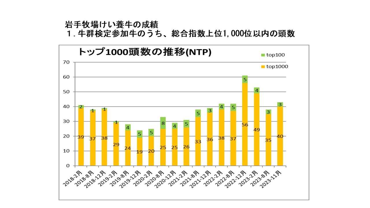 令和5年11月28日にホルスタイン種評価結果(2023-11月)が公表され、岩手牧場けい養牛のうち、牛群検定参加牛の総合指数上位がWHG デリア ニユージー トライミー ET(NTP(総合指数):+3108)で18 位(初ランクイン)に、未経産牛の総合指数がWHG キム レーヨン ペイロード ET(NTP(総合指数):+3692)で8位(前回3位)にランクインしております。