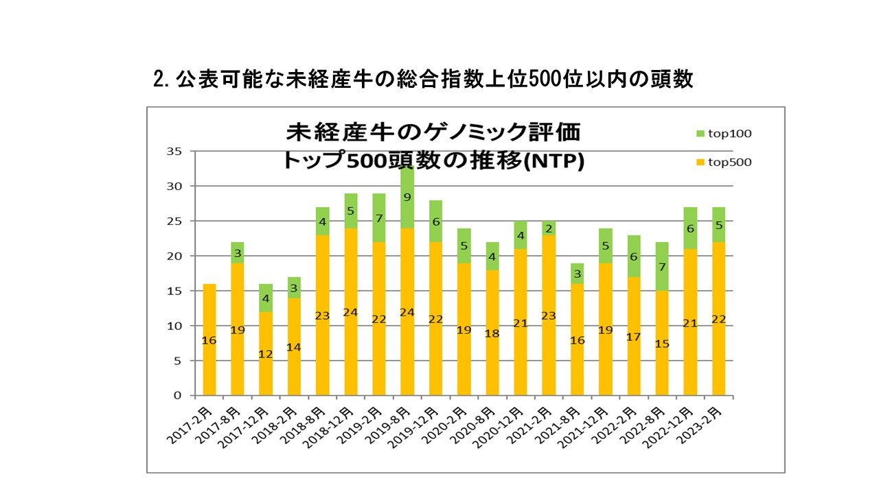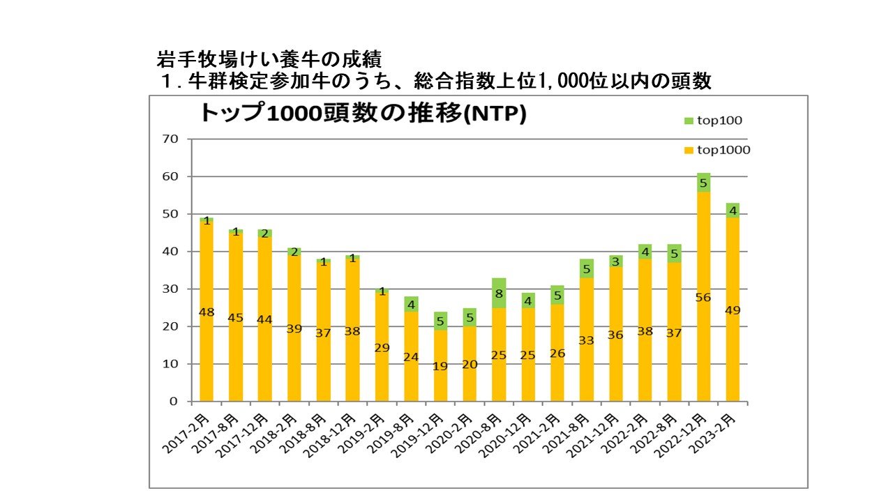 令和5年2月21日にホルスタイン種評価結果(2023-2月)が公表され、岩手牧場けい養牛のうち、牛群検定参加牛の総合指数上位がRE ローズマリー ジーク ペニア ET(NTP(総合指数):+3021)で48位(前回42位)に、未経産牛の総合指数がRE ザツプ エメンタール ジヤマルコ セカンド(NTP(総合指数):+3422)で33位(前回12位)ランクインしております。