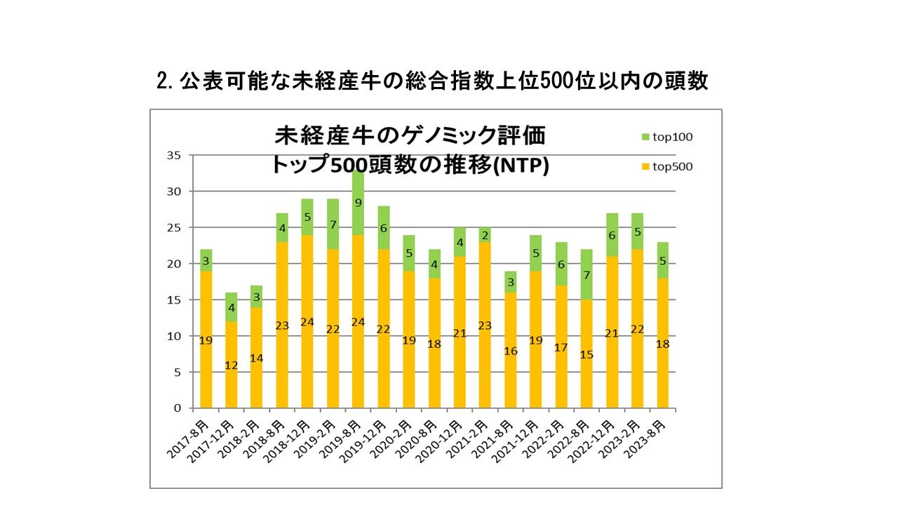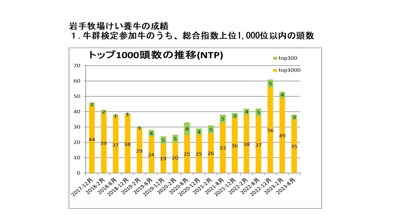 令和5年8月8日にホルスタイン種評価結果(2023-8月)が公表され、岩手牧場けい養牛のうち、牛群検定参加牛の総合指数上位がWHG エロス ミーク マイルストン サード ET(NTP(総合指数):+2808)で49位(前回78位)に、未経産牛の総合指数(8月16日公表版)がWHG キム レーヨン ペイロード ET(NTP(総合指数):+3727)で3位にランクインしております。
