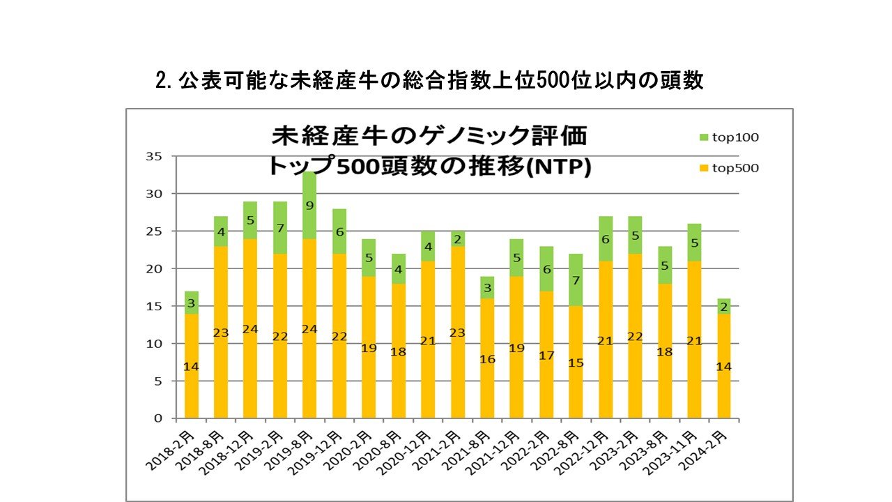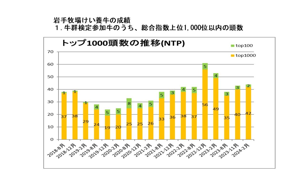 令和6年2月13日にホルスタイン種評価結果(2024-2月)が公表され、岩手牧場けい養牛のうち、牛群検定参加牛の総合指数上位がWHG デリア ニュージー トライミー ET(NTP(総合指数):+3120)で17位(前回18位)に、未経産牛の総合指数がWHG キム レーヨン ペイロード ET(NTP(総合指数):+3523)で48位(前回8位)にランクインしております。