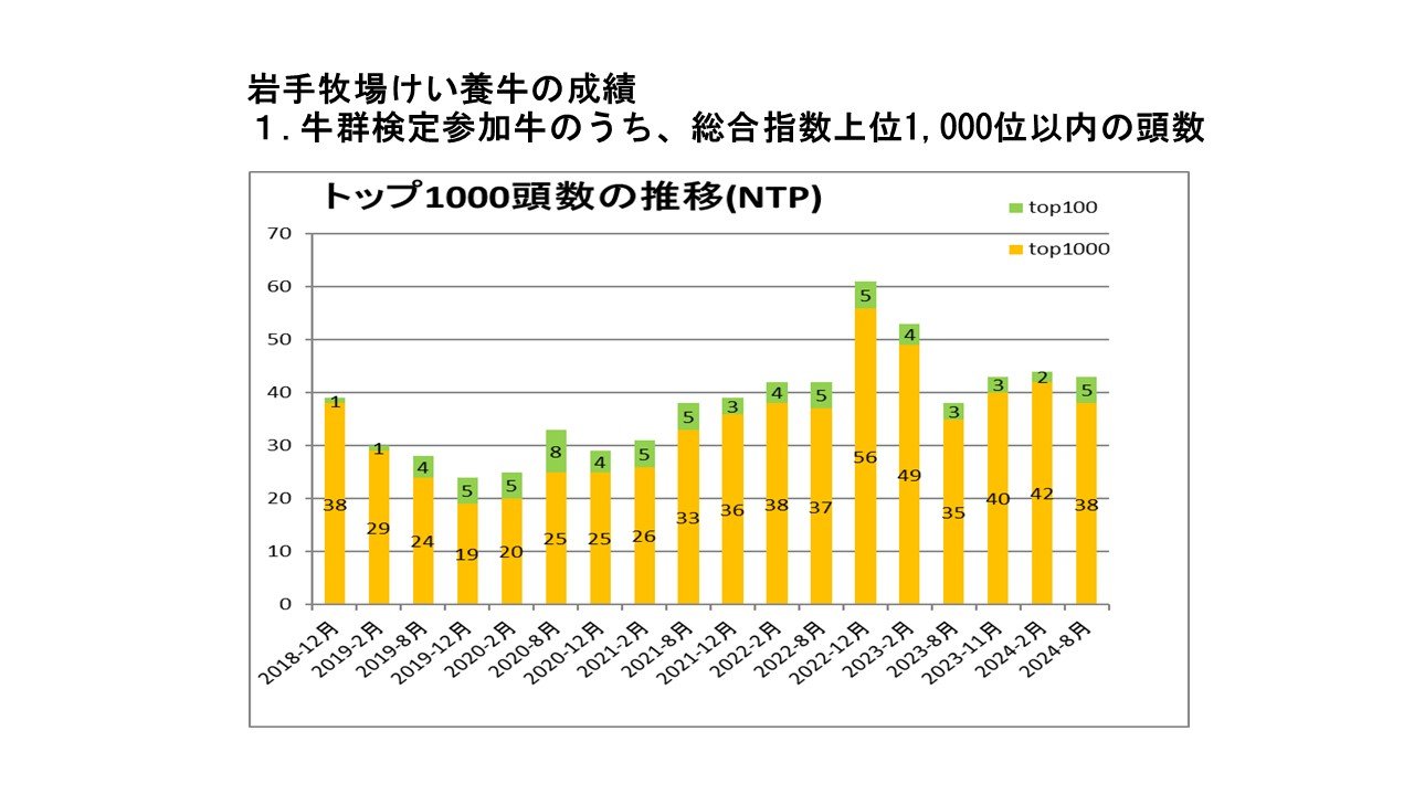 令和6年8月6日にホルスタイン種評価結果(2024-8月)が公表され、牛群検定参加牛の総合指数上位1500位にて家畜改良センター生産牛として初めて、岩手牧場けい養牛の「WHG フレク ニユージー トライミー ET(NTP(総合指数):+3531)が全国1位にランクインしました。