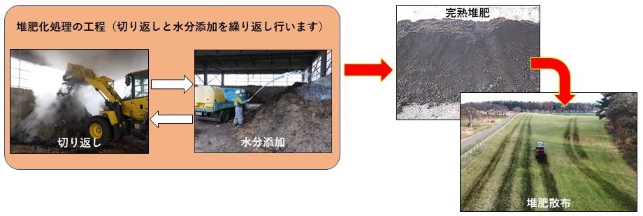 この乳用牛からは、ふん尿が年間約11,300トン排泄され、これらは切り返しによる完熟堆肥化やバイオガスプラントによる消化液化の過程を経て、全量を肥料として土壌に還元し牧草の肥料として利用しています。