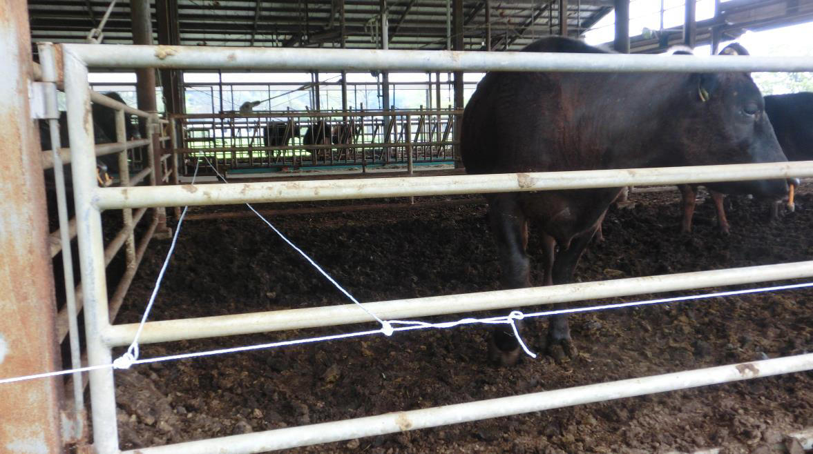 宮崎牧場では、電気牧柵へ馴致方法として牛舎内にポリワイヤーを張り、電気を流します。馴致にかかる日数は約7~10