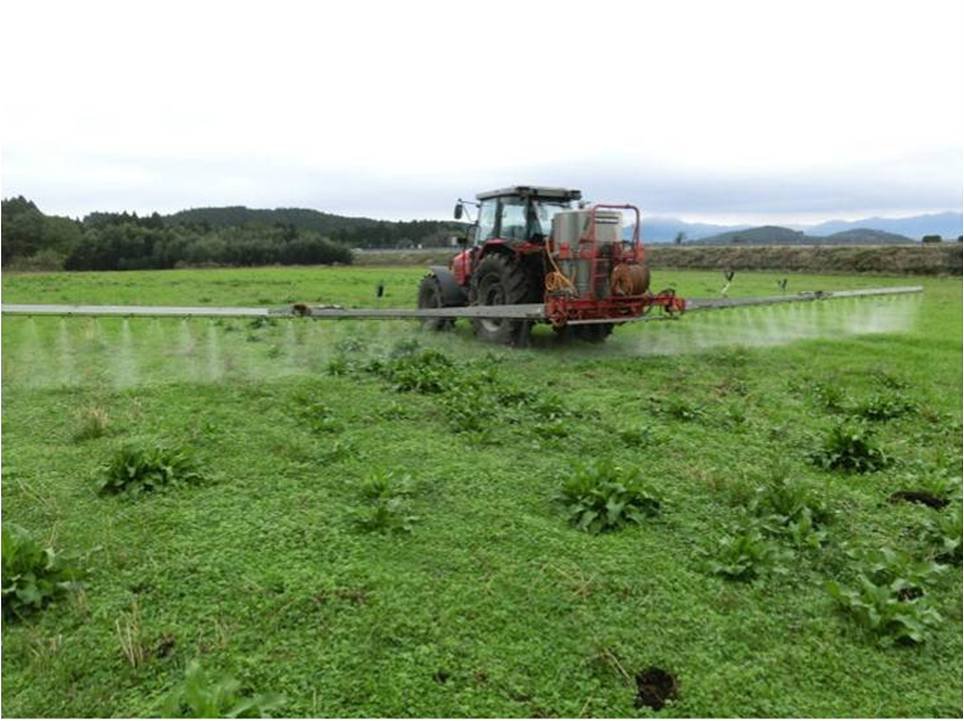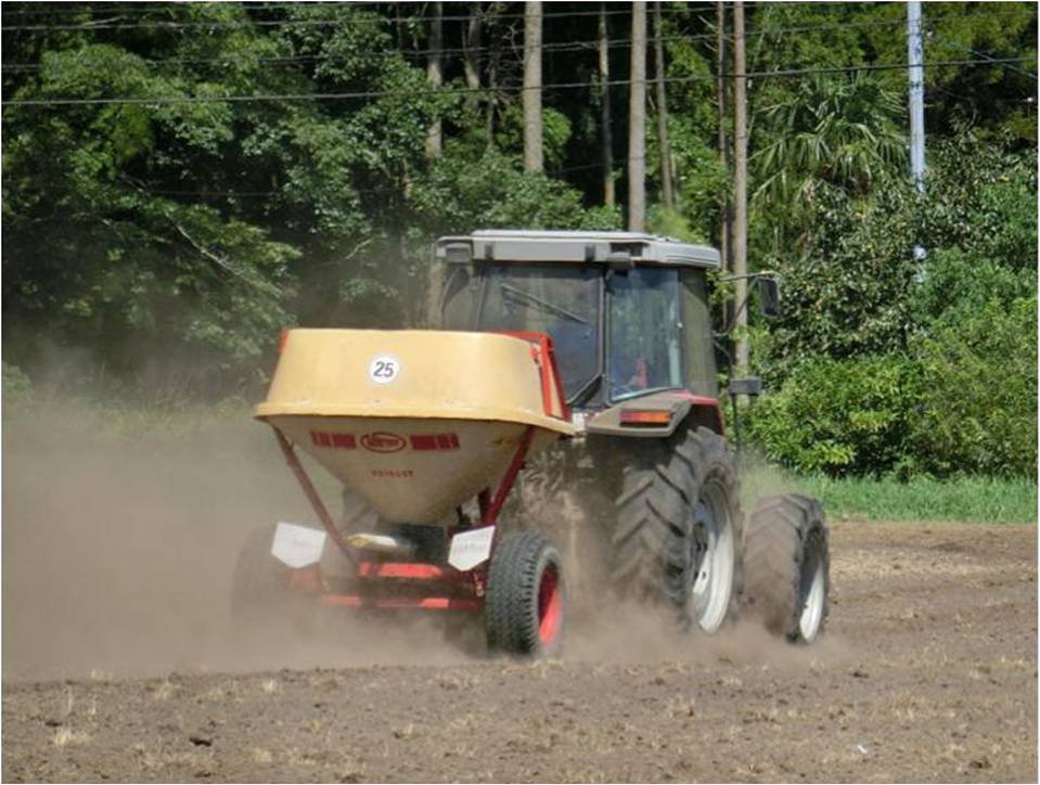 ライムソアーにより、石灰などの粉状の資材を散布します。