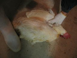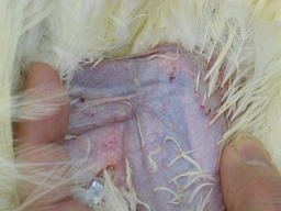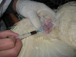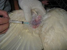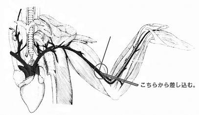 翼の付け根にあるY字型の血管の交差点に向け、なるべく血管から離れた回内筋から腱(写真左の「スジ」の部分)の下を通しつつ針を刺します。血管に針先が入った感触を確認して位置を固定し、ゆっくりシリンジの内筒を引き、採血を行います。また、採血終了後は、針の刺さった血管の部位を指で圧迫し止血します。