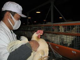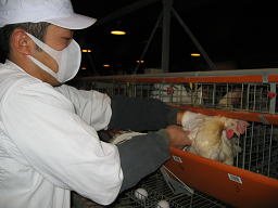 岡崎牧場では、全羽数衛生検査を行うために、1日に1,200羽程度の採血を行うことがあります(平均:1人当たり2時間で100羽の採血)。この中でも熟練した採血技術を持つ職員(1時間当たり100羽)の採血技術についてご紹介します。