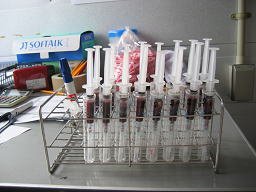 当場では、作業の効率化のため、鶏舎で採血した血液は写真のように注射筒に入れたまま血清分離させています。暖かいところで安置すれば、血清と血餅に自然分離します(インキュベーター使用の場合、41~42℃で2時間程度)。