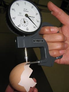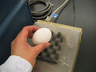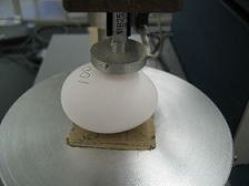 卵殻の強さを機械によって測定します。この機械により卵に圧力をかけ、卵が割れた際の強さをもって卵殻強度としています。