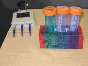 (写真左:分注器、写真中央:50ml遠沈管と専用ラック、写真右:診断液の分注)