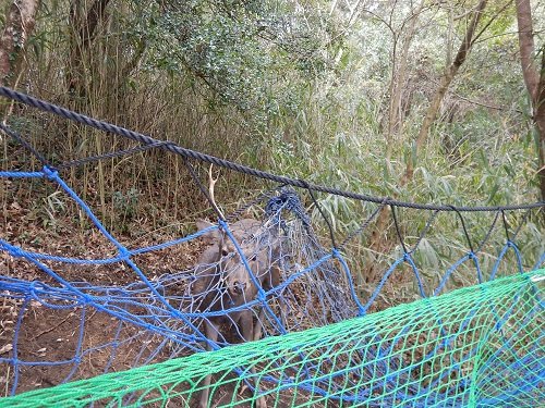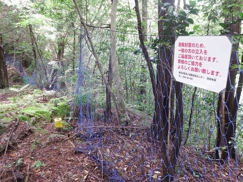 防獣網:牧場の外縁に沿って、支柱を用いず木間でロープをかけて設置。また一般人の迷い込みを防止するため、注意喚起札を貼っている。