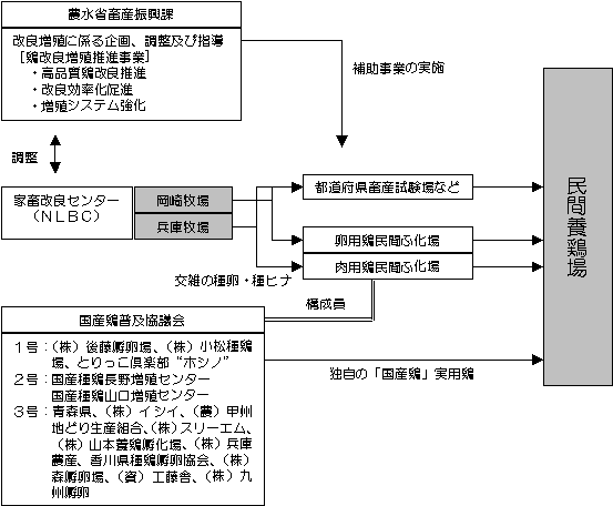 改良した鶏をより多くの養鶏場で飼養してもらうべく、以下のように、産・官の連携による国産鶏の普及体制をとっています。