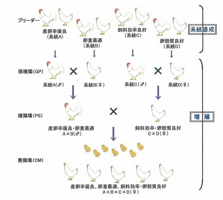 CM鶏はブリーダーが保有する優れた特徴を持った系統の組合せによってできています。これは、組合せにより、両親の平均値よりも良い成績が出るという雑種強勢(ヘテローシス)を利用しているからです。このようなことから、ブリーダーの保有する系統の成績が優秀であることが基本であり、次いで、それら系統の組合せによりヘテローシスがよりうまく働いたものがCM鶏として用いられます。その優劣によって近代養鶏30年の優劣が決せられてきました。つまり、系統造成は育種改良にとって最も重要な作業です。
