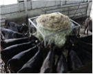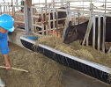 奥羽牧場では、ロールベールカッターという機械で、10数センチに切断して、飼槽に入れて給与する場合と、トラクターやホイルローダーで草架という枠にそのまま1個を入れて、直接食べさせる場合があります。草架の場合は、牛が引き出して踏みつけるなど、多くのロスが発生する欠点があります。切断して給与する場合、強い牛がたくさん食べてしまわないように、スタンチョンなどを使うと有効です。