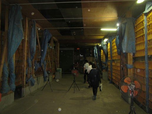 施設内部。コンテナにニンニクを入れて積み上げ、通風・乾燥させている。